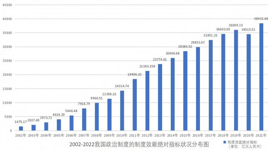当代中国政治制度要在“ 十四五” 时期和到2035年基本实现现代化或者在本世纪中叶完全实现现代化,并没有一个明确的量化指代化要求。但是,如果当代中国政治制度的制度效能在对国家经济发展的贡献上(如上图所示)是逐年递增的且在一个较长时期内处于正态、稳态和连续之中,那就说明当代中国政治制度的逐步确立、完善和发展是符合当代中国经济发展理性、政治发展理性和社会发展理性的。如果延续此种发展态势,那么,完全有理由相信,到“ 十四五” 时期和到2035年,当代中国政治制度能基本实现中国式现代化,也就是说,当代中国政治制度通过逐步确立、完善和发展能基本达到中国式现代化要求。同样有足够理由相信,到本世纪中叶,当代中国政治制度能实现中国式现代化,也就是说,当代中国政治制度通过逐步确立、完善和发展能完全达到中国式现代化要求。