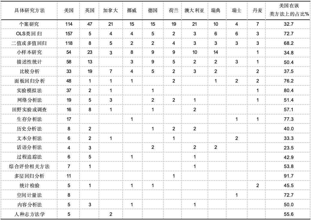 统计显示,在8本外文政治学期刊中,由于第一作者国家为美国所刊发的论文在数量级上领先,因此,美国作者所使用的具体研究方法在数量上也更多。但美国学者在具体研究方法上具有很大的差异。例如几种主要的定性分析方法,如个案研究、比较分析、小样本研究等,美国学者在该类方法的运用上占比均不超过40%;而在一些定量分析方法上,美国学者的运用比例较高,如OLS类回归、二值或多值回归、面板回归分析、实验模拟法、生存分析法、多层回归分析、空间计量法,美国学者在该类方法上的占比远高于50%,除了二值或多值回归分析占比为68.2%,其余均在70%以上。