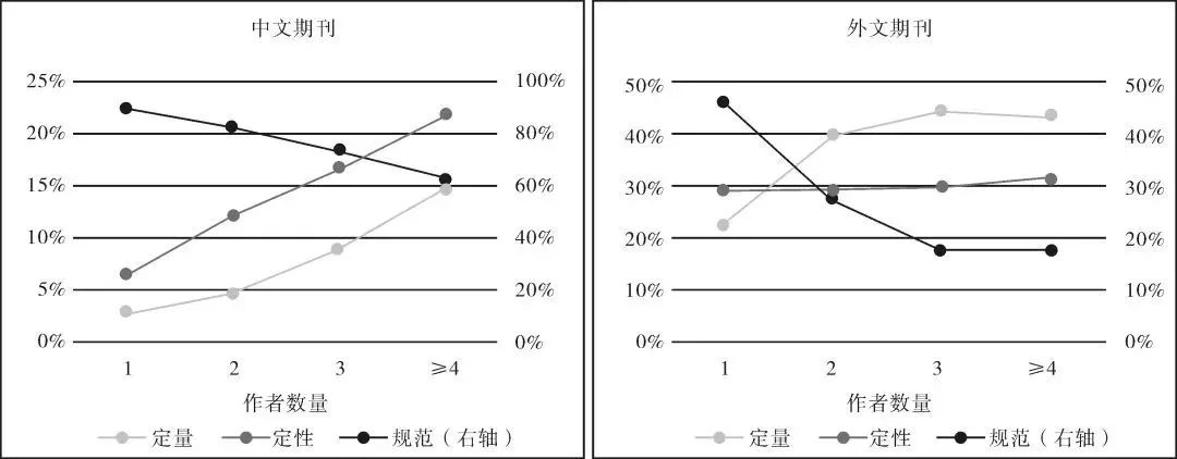 我们进一步分析作者数量与政治学期刊论文研究方法类型之间的关系。统计显示,作者数量与政治学期刊论文的定量方法使用之间存在明显的正相关关系,总体上多人合作的政治学期刊论文使 用定量方法进行研究的比例较高。作者为1人时,中文政治学期刊使用定量方法进行研究的比例为 2.9%,而当作者大于等于4人时,中文政治学期刊使用定量方法进行研究的比例上升至14.8%;作者为1人时,外文政治学期刊使用定量方法进行研究的比例为22.7%,而当作者为3人时,外文政治学期刊使用定量方法进行研究的比例上升至44.6%。当然,中外也存在明显的差异,外文政治学期刊作者数量大于等于 2人后,定量方法的使用比例差异就不是特别明显了,而中文政治学期刊作者数量越多,使用定量方法的比例就越高。这可能与中国发表论文中比较看中资历、话语权有关。 除了定量研究的论文需要更多研究者合作之外,定量论文要发表在高级别的中文期刊上,还需要作者具有一定的资历、话语权等。 例如,如果论文作者中包括著名专家,则期刊编辑、审稿专家往往会更加慎重处理,稿件录用的概率也更高,因此,为了提高被录用的概率,论文写作者往往会寻找学科专家合作挂名。这一点从中外文期刊不同作者数量的比例也可以得到印证,中文期刊的单独作者比例为18.5%,而外文期刊的单独作者比例为58.8%,可见,中文期刊的作者署名中,很可能存在较严重的挂名不出力的情况。