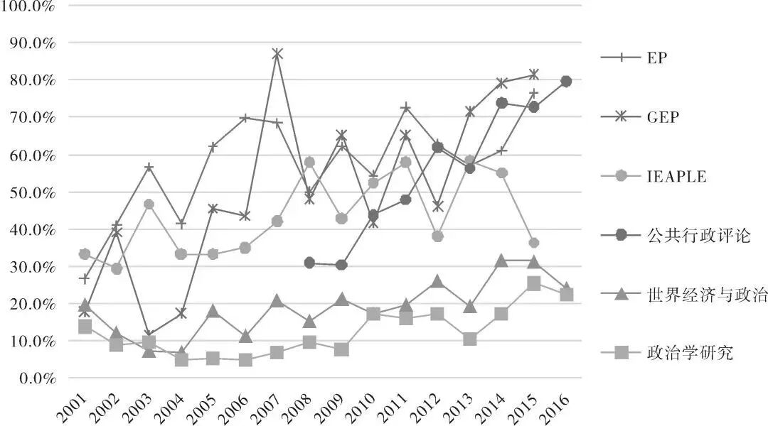 中文期刊中,《公共行政评论》所刊论文使用实证方法的比例相对比最高,上升趋势十分明显,在实证方法的使用比例上与外文期刊不分上下,甚至比有的外文期刊所刊论文使用实证方法的比例更高,2016年,所刊论文使用实证方法的比例达79.6%。《世界经济与政治》和《政治学研究》处于一个档次,自2014年左右开始,所刊论文使用实证方法的比例有所提高。2015年,《世界经济与政治》和《政治学研究》所刊论文使用实证方法的比例分别为31.3%、25.4%。另外,《政治学研究》自2015年开始,更频繁地选登了定量分析论文,在实证论文中的比例超过50%。
