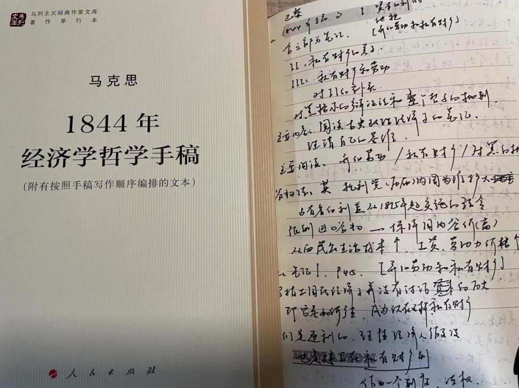 首先是被马克思在求索真理的道路上的不懈精神所感染。1844手稿作为马克思对资产阶级经济学和各类社会主义文献研究的成果,汇集了大量的摘录和札记。这些摘录内容涉及著作广泛,重点明确,细致考究。众所周知,马克思在撰写1844手稿时正处于其思想的转向期。面对陌生的社会经济领域,马克思在较短的时间内就获得了系统性的认识,这很大程度上归功于他本人的治学精神。